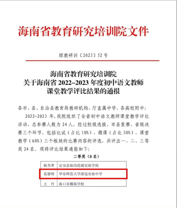 喜报:热烈祝贺我校袁德明老师在海南省2022-2023年初中语文课堂教学评比活动中获得全省二等奖