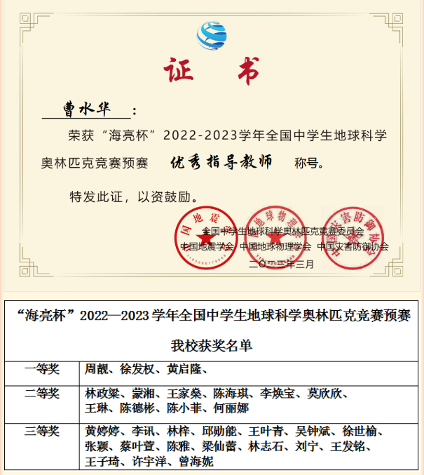 在“海亮杯”2022—2023学年全国中学生地球科学奥林匹克竞赛预赛中,我校师生成绩显著,其中一等奖3人,二等奖10人,三等奖18人,曹水华...