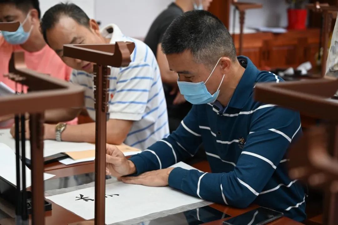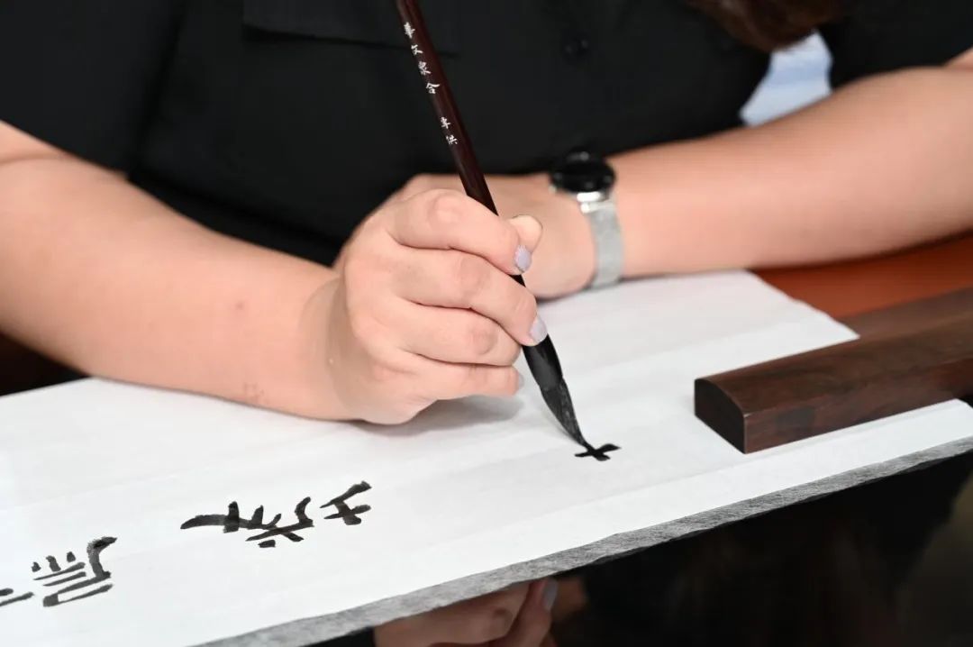 著名教育家沈尹默在《书法论丛》说:“世人公认中国书法是最高艺术,无色而具图画之灿烂,无声而有音乐之和谐,引人欣赏,心畅神怡”。华迈实验中学美术教师任艺铭结合民间习俗设计的《隶书之斋号匾额的创作》课程在华迈新建的特色书法教室开展,听课教师和学生一起共同体验隶书练习,任艺铭老师挥笔示范。