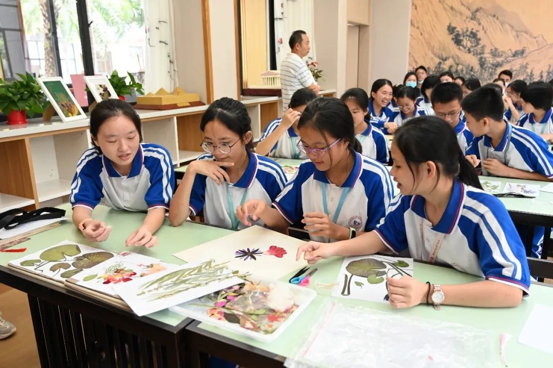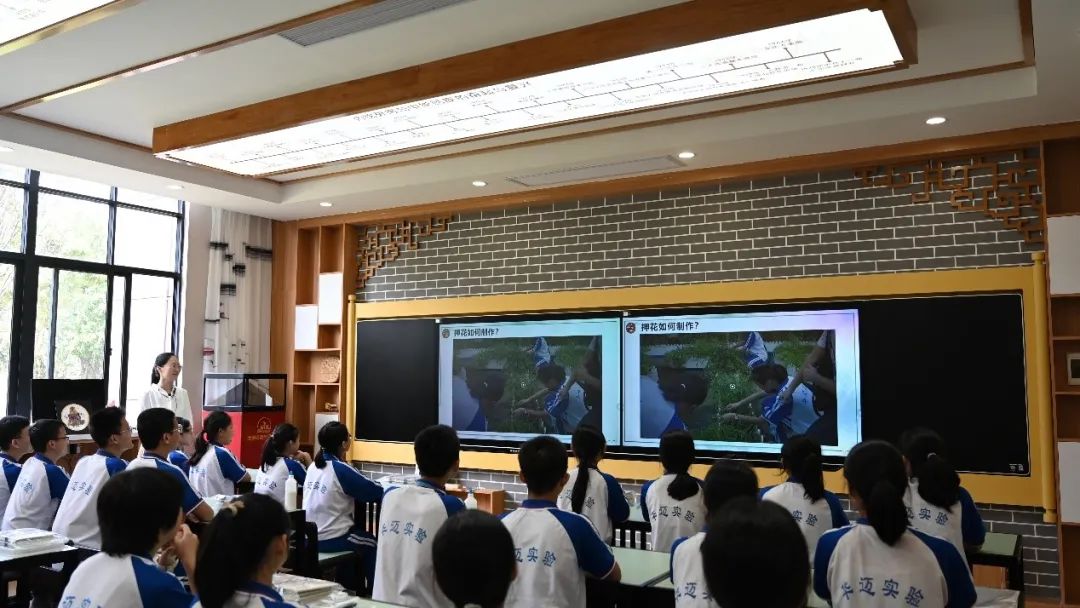 华迈实验中学美术老师王奕录的授课是《押花画》,该课程取材于校内外丰富的植物资源,尤其是教学楼天台的空中农场里百花园、百草园、百药园、百树园、百果园中花草植物。课前,老师先要带领学生采集、处理和压制植物,师生在感受自然之美和劳动的乐趣的同时,也亲手准备好了课程资源。