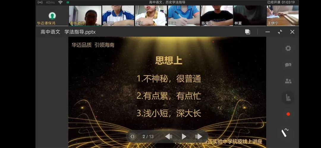 教无定法,贵在得法。华东师范大学澄迈实验中学将继续砥砺前行,在教学之路上初心不改,努力探索研究线上教学的最佳途径,顺应互联网+教育时代,助力学生的成绩提升和学生个人素质的成长!