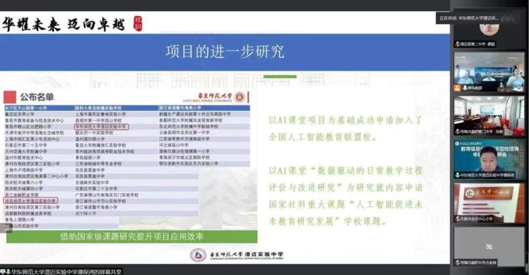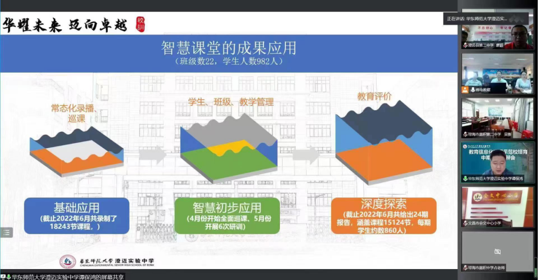 2022年9月20日,海南省教育厅发文:华东师范大学澄迈实验中学在第三批(2021年)海南省中小学教育信息化应用示范校培育中期评估结果公示中被评为“优秀”。据悉,根据《海南省教育厅关于开展2021年全省中小学教育信息化应用示范校培育中期评估工作的通知》要求,在学校总结自评的基础上,省教育厅组织专家对入选第三批(2021年)40所全省中小学教育信息化应用示范培育的项目校进行了中期评估。本次中期评估答辩通过线上开展。专家组通过认真评审各校报送的材料、听取学校陈述、答辩及综合评议,评出5所学校为“优秀”。