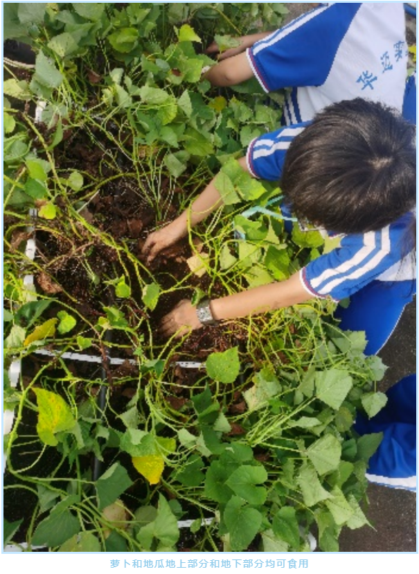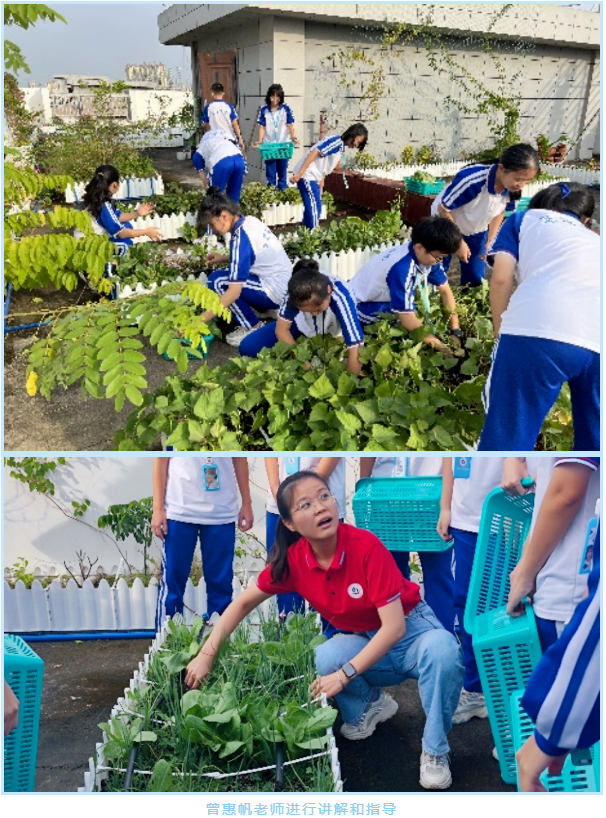 01 高中:鼎新楼空中菜园 下午第八节课,高一生物曾惠帆老师和搭档政治李宁老师带领高一各班学生代表对空中花园植物进行讲解。学生们不时发出“原来如此”的感悟,同时各班同学在认识作物过程中进行选取,最后分别摘取芥菜、地瓜、白菜和韭菜等植物进行烹饪。活动中学校团委负责人张文思和高一年部主任侯殿勋对学生们也进行了指导。