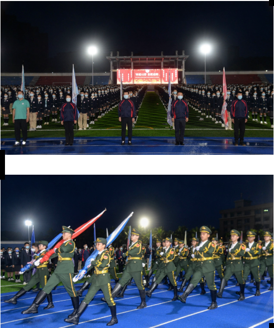 黎明未晓,风雨球场耀眼的灯光下,蔚蓝色的跑道与青绿色的绿荫球场交相呼应,晨起的音乐打破了静谧的清晨,华迈学子们擦亮惺忪的睡眼,以矫健的步伐聚集在风雨球场等待升旗仪式。漂亮的礼服,庄重的仪仗队尽显华迈学子的精神风貌。澄迈县校长团队拿起手机抓拍我们的学生,眼中流露着肯定与敬佩。