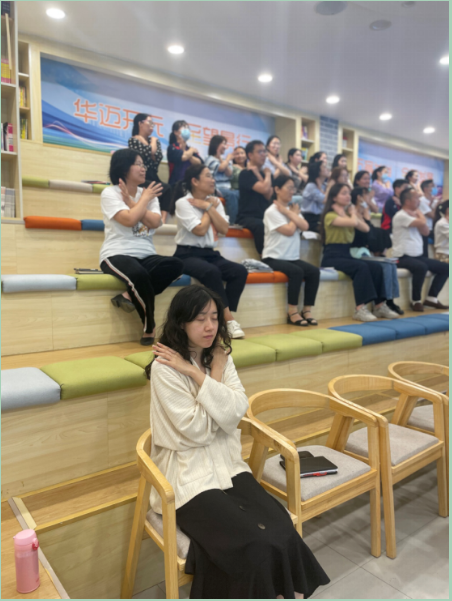 接着由徐思雨老师介绍我校心理危机干预流程和应急危机干预的应对方式等,尤其是当启动危机干预后,班主任、心理老师及校方相应的应对步骤。最后,徐思雨老师带领全场教师在放松的音乐中体验心理赋能技术---蝴蝶拍,全体教师集体聚心赋能,心育未来。
