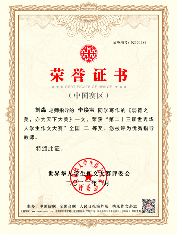 4月6日,由中国侨联、全国台联、人民日报海外版、快乐作文杂志联合主办的“第二十三届世界华人学生作文大赛”获奖结果揭晓,经过严格的初审、复审、终审、复核,在来自46个国家和地区的280多万份参赛作文中,我校共有9名学生获奖,其中二等奖4名,三等奖5名。